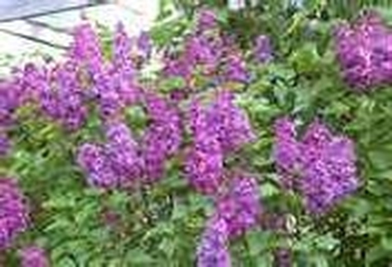 Spot a lilac bush by the fragrant purple, red or white flowers that bloom on the sprig. The flowers are small, and in small clusters, which creates a large group of flowers along the end of the stem. The flowers bloom in late spring and continue until mid- to late June. The lilac bush can either be trimmed to stay smaller or pruned to grow into trees. The scent of the lilac bush can be smelled from a long distance, and is so strong that it is used often in perfumes and incense.
