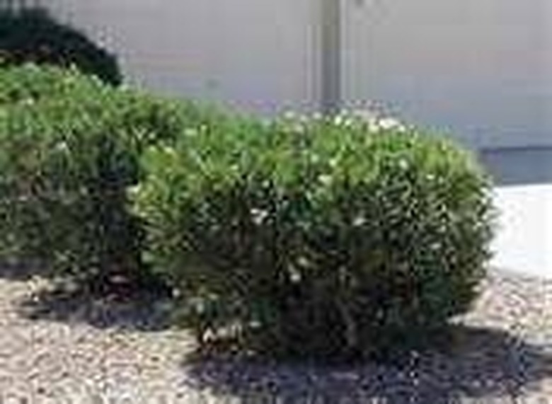 Identify oleander bushes by the large showy flowers in vibrant colors in the spring. The flowers also have a fairly long tube with flower petals up to 1 inch long. The oleander bush is preferred for its ease of pruning into shapes or use as a privacy hedge when allowed to grow large. The oleander stays green throughout the year; however, this plant can be toxic if ingested, so is not recommended for households with pets or children.