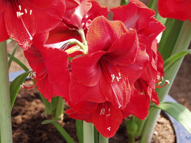 Plant amaryllis bulbs in pots any time from October to April. Flowers appear seven to 10 weeks after planting.