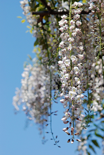 White wisteria perennial vines are a favorite in the garden with their delicate fragrance and clusters of pea-like blossoms hanging in 1- to 3-foot clusters of pastel colors, such as violet, blue or white. Wisteria is a woody vine native to North America and eastern Asia that blooms in late spring and reaches heights up to 30 feet or more if not kept pruned back. Spread over a trellis, fence, arbor or tree, this vine creates a beautiful canopy of color.