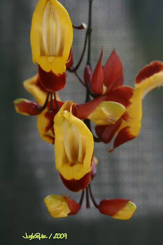 Lady Slipper Vine (Thunbergia mysorensis) has long chains of unusual lipped flowers. It is also called Brick and Butter Vine because the flowers are russet red and yellow. It is an exotic vine and attracts hummingbirds. Sweet Clock Vine (Thunbergia fragrans) has small fragrant flowers. The flowers of white, yellow, lavender or blue can grow singly or in clusters.