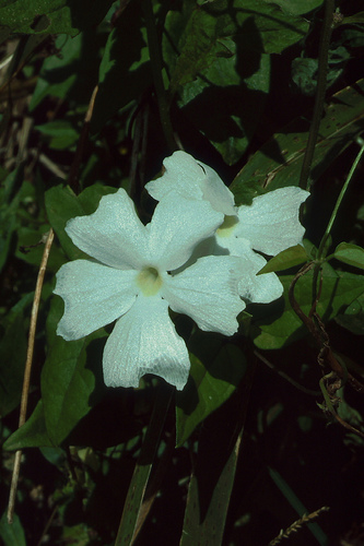 Bush Clock Vine (Thunbergia erecta) is also called King's Mantle. It is a shrub that grows 6 feet high and wide. It has small leaves and flowers that are purple with yellow throats, appearing singly or in clusters. The Scrambling Sky Flower (Thunbergia battiscombei) has brilliant blue-purple flowers from mid-summer to fall. It is smaller and less rampant than the Bengal Clock Vine. It can be grown without support and will form a symmetrical mound 4 feet high and 6 feet across.