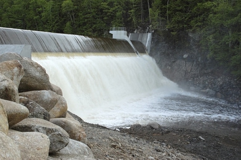 Determine the dimensions of the spillway, or the cut-out section in the top of a dam wall that water flows through. A spillway keeps the river within its banks as it passes over the waterfall and ensures that the stream's flow never rises above the top of the dam. Use a cut-out with the same area as the cross-section you found in Step 2, though you may choose to change the dimensions. Wider spillways allow for larger drop heights, but be sure that the stream doesn't exceed the width of the banks downstream.