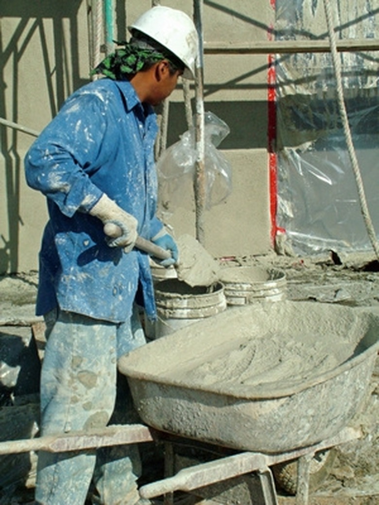 Mix your concrete mortar in the wheelbarrow using Portland cement, clean sand and water. Use about six times more sand than cement, and just enough water to make the concrete workable (too much will weaken the final product). Begin by mixing small batches of concrete until you gain confidence with the proportions.